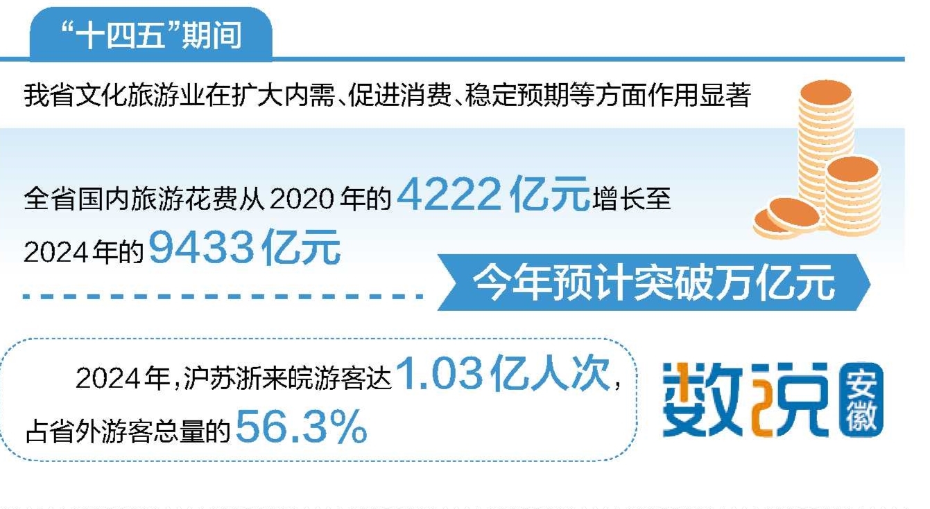 省文化和旅游厅厅长周明洁介绍★◈★✿,“十四五”期间★◈★✿,我省文化★◈★✿、旅游及相关产业增加值占GDP比重稳步提升★◈★✿,2023年达4.26%★◈★✿,2024年升至5.2%★◈★✿,文化旅游业在扩大内需★◈★✿、促进消费★◈★✿、稳定预期等方面作用显著★◈★✿;全省国内旅游花费从2020年的4222亿元增长至2024年的9433亿元★◈★✿,今年预计突破万亿元★◈★✿;2024年★◈★✿,沪苏浙来皖游客达1.03亿人次★◈★✿,占省外游客总量的56.3%★◈★✿;“高铁+旅游”获评深入推进长三角一体化发展实践“十佳”创新案例★◈★✿;安徽“入境游”表现亮眼★◈★✿,今年1月至10月★◈★✿,全省接待入境游客人次与国际旅游收入同比分别增长68%和59%★◈★✿。